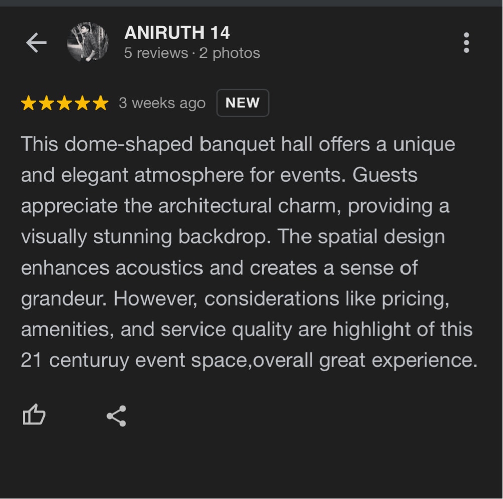 This dome-shaped banquet hall offers a unique and elegant atmosphere for events. Guests appreciate the architectural charm, providing a visually stunning backdrop.