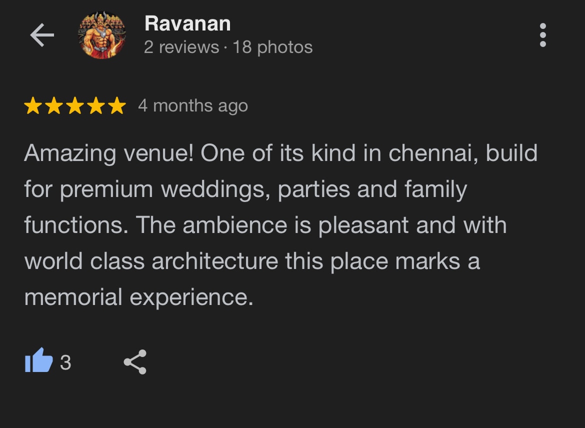 Amazing venue! One of its kind in chennai, build for premium weddings, parties and family functions. The ambience is pleasant and with world class architecture this place marks a memorial experience.